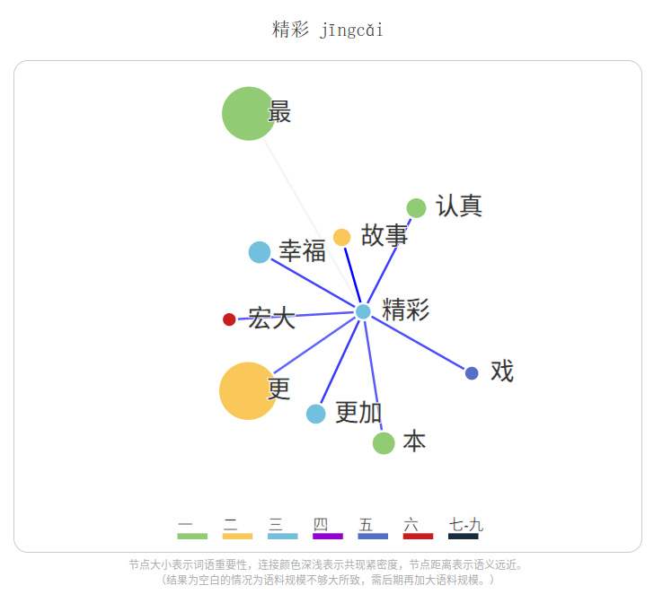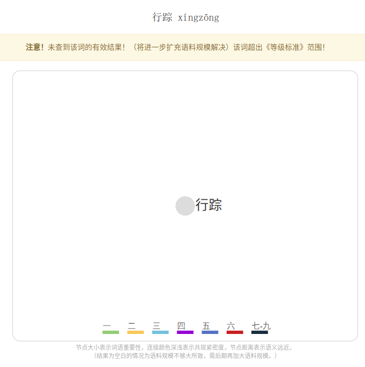 在三个子项目中,《等级标准》范围内的词语在图谱中均用不同的颜色或数字进行表示。对超出《等级标准》范围的查询词语,均进行提示,并在图谱图中用灰色表示。
