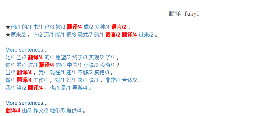 在例句检索子项目中,所有的句子均自动分词后,标注其所在词汇等级。结果中不包含出现超纲词的句子。句子展示的优先顺序为:同时包含两个查询词的句子 > 仅包含一个查询词的句子;词汇等级小于等于当前查询词的句子 > 词汇等级有大于当前查询词的句子;教材语料的句子 > 网络语料的句子;词语数少的句子 > 词语数多的句子。